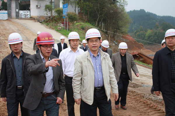 2012年4月6日,江西省水利廳副廳長廖瑞釗在宜春市副市長賴國根的陪同下,深入我公司承建的銅鼓縣大塅水庫除險加固工程項目視察指導工作。
