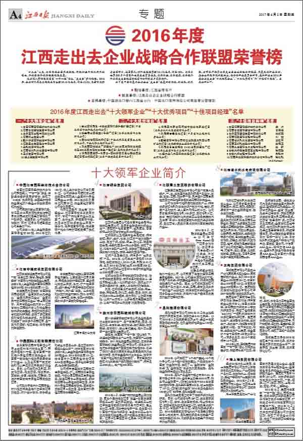 6月3日,江西走出去企業(yè)戰(zhàn)略合作聯(lián)盟2017年大會在南昌召開。省委常委、常務(wù)副省長毛偉明出席大會并作重要講話,會上省委常委、常務(wù)副省長毛偉明、省政府秘書長王亞聯(lián)和省商務(wù)廳廳長王水平分別為2016年度全省走出去“十大領(lǐng)軍企業(yè)”、“十大優(yōu)秀項目”和“十佳項目經(jīng)理”授牌。江西走出去企業(yè)戰(zhàn)略合作聯(lián)盟輪值主席、中國江西國際經(jīng)濟技術(shù)合作公司總經(jīng)理徐國建報告了2016年工作,國家開發(fā)銀行江西分行、中國進出口銀行江西省分行和中國出口信用保險公司南昌營管部作為聯(lián)盟副主席單位發(fā)言。公司董事長王元旦作為十大優(yōu)秀項目的企業(yè)代表發(fā)言。《江西日報》、《江西衛(wèi)視》相繼對大會進行了大幅報道。