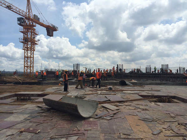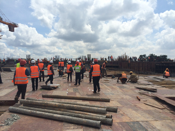 “雙河”項(xiàng)目是一個(gè)集零售商場、現(xiàn)代辦公樓、公共娛樂以及配套設(shè)施的綜合性工程,作為東非最大的在建城市綜合體,總建筑面積為18.2萬平方米,單層面積就超過四萬多平米。雖然出國前我對(duì)“雙河”項(xiàng)目就有一定的了解,但親臨現(xiàn)場,感受工地的壯觀,內(nèi)心仍然受到巨大的震撼。這個(gè)項(xiàng)目涉及到的工程類別較多,施工統(tǒng)籌及安全質(zhì)量監(jiān)控難度較大。在施工現(xiàn)場,我們看到各作業(yè)工種工作安排得井井有條,各類安全標(biāo)識(shí)及安全設(shè)施科學(xué)規(guī)范,雖然現(xiàn)場施工作業(yè)人數(shù)超過1000多人,但讓人感覺既熱火朝天,又忙而不亂有條不紊地進(jìn)行著。