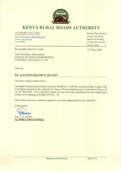 肯尼亞分公司向肯尼亞鄉(xiāng)村公路局捐贈口罩
